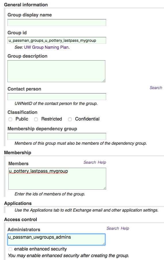 - Create a UW Group containing the users you would like to have access to a LastPass shared folder. Create a new group specific to this purpose which is logically under your department’s parent LastPass group. So if your department’s parent LastPass group is u_pottery_lastpass, you might create u_pottery_lastpass_mygroup
